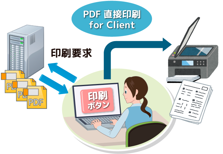 サーバ上にあるPDFファイルを、クライアントに接続されたプリンタにWebブラウザ経由で印刷するためのソリューションです。